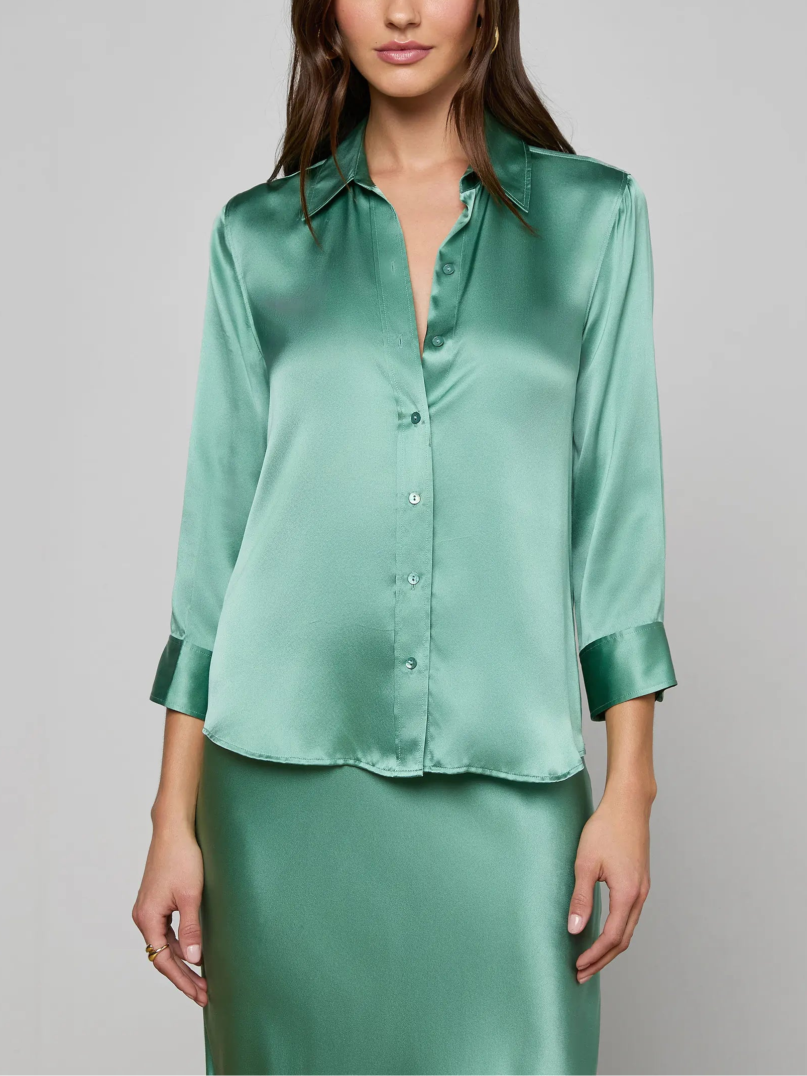 The iconic silk button-down that belongs in every wardrobe. This all-time bestseller is constructed with three-quarter length sleeves designed to perfectly showcase your jewelry—no sleeve rolling required. Our signature Dani blouse is back in a soft malachite green.