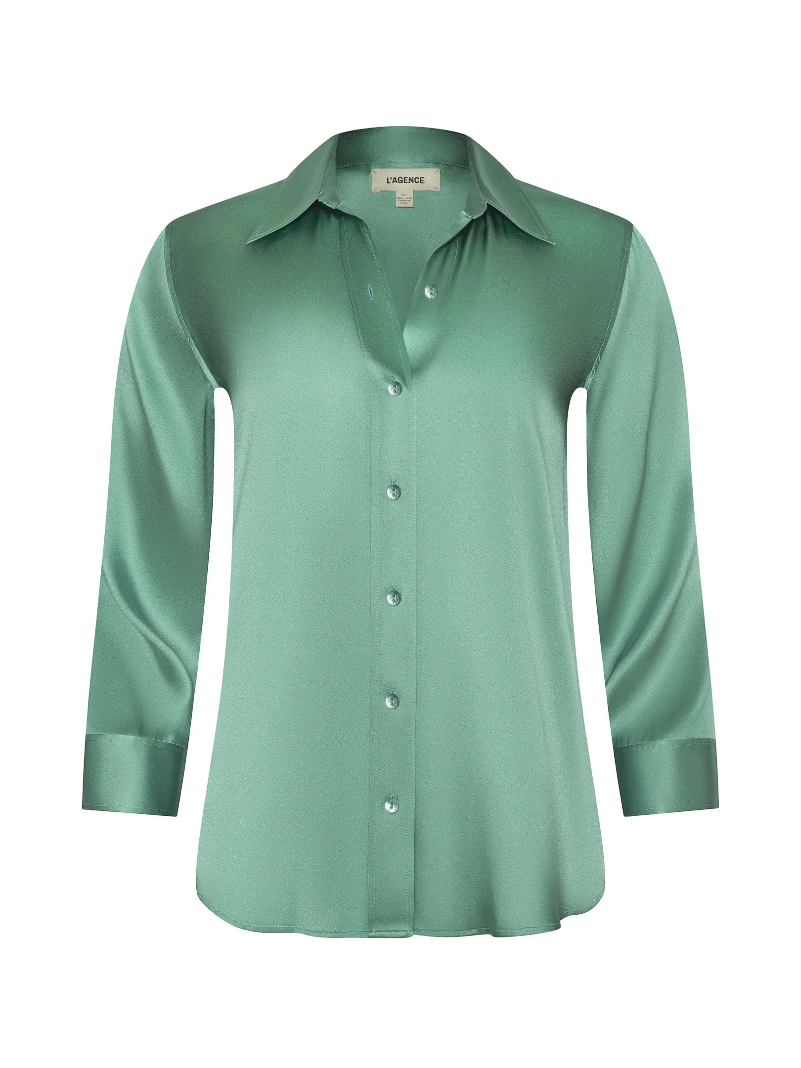 • 100% silk charmeuse • 3/4 sleeves • High-low shirttail hem • Slim fit • Front button closure
