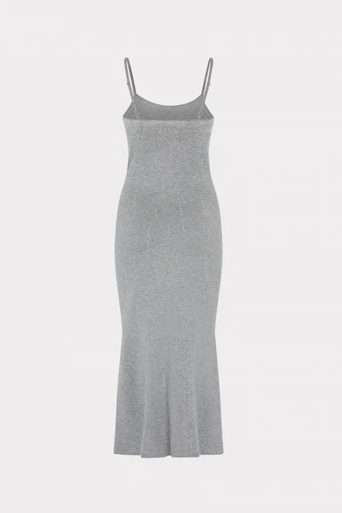 Cut from a festive high shine metallic fabric, the Ricky dress is designed as a curve hugging mermaid silhouette that flares out just above the ankles. Stunning, comfortable, and easy to wear.