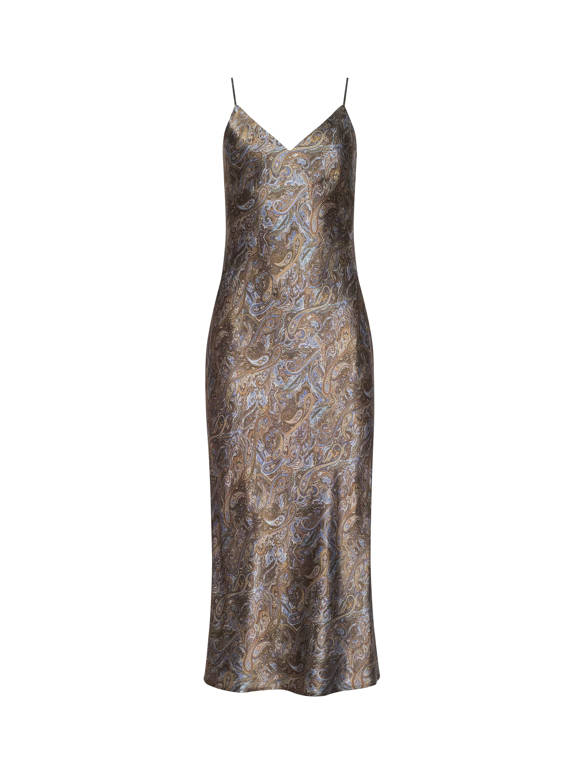 The iconic silk slip dress, now in a bold, lustrous paisley print.