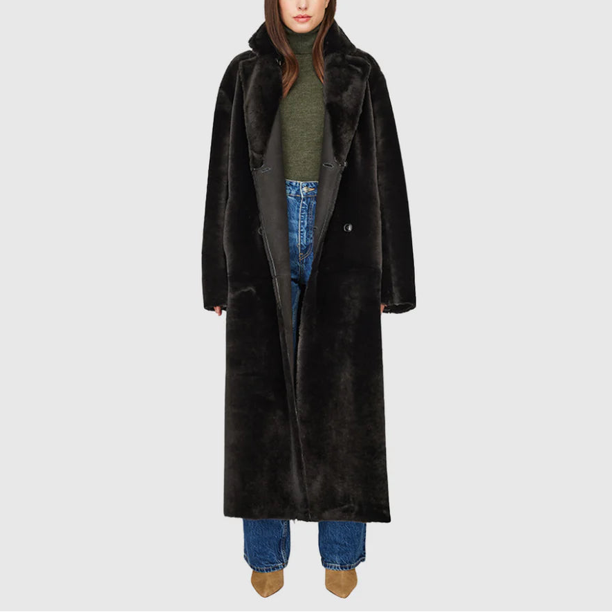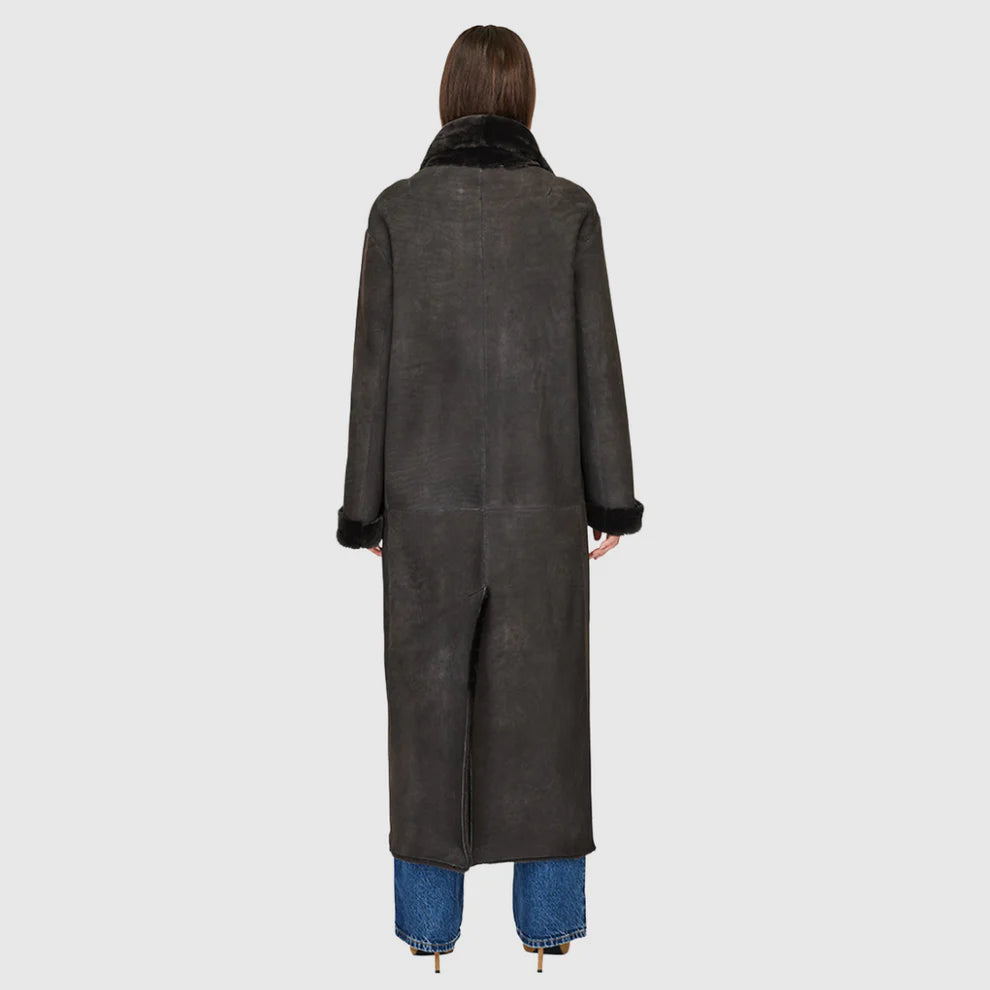 The DANIELLE Duster is a statement in heritage-inspired luxury and modern versatility. Crafted in black vintage iron wool and plush iron wool shearling, this reversible oversized coat transitions effortlessly from sleek leather to cozy teddy texture. Its elongated silhouette is enhanced with a slight drop shoulder, back vent, and double-breasted button closure, creating timeless elegance with functional edge. Practical single welt pockets on the suede side and slash pockets on the wool side make DANIELLE a refined choice for après-ski escapes or elevated city dressing.