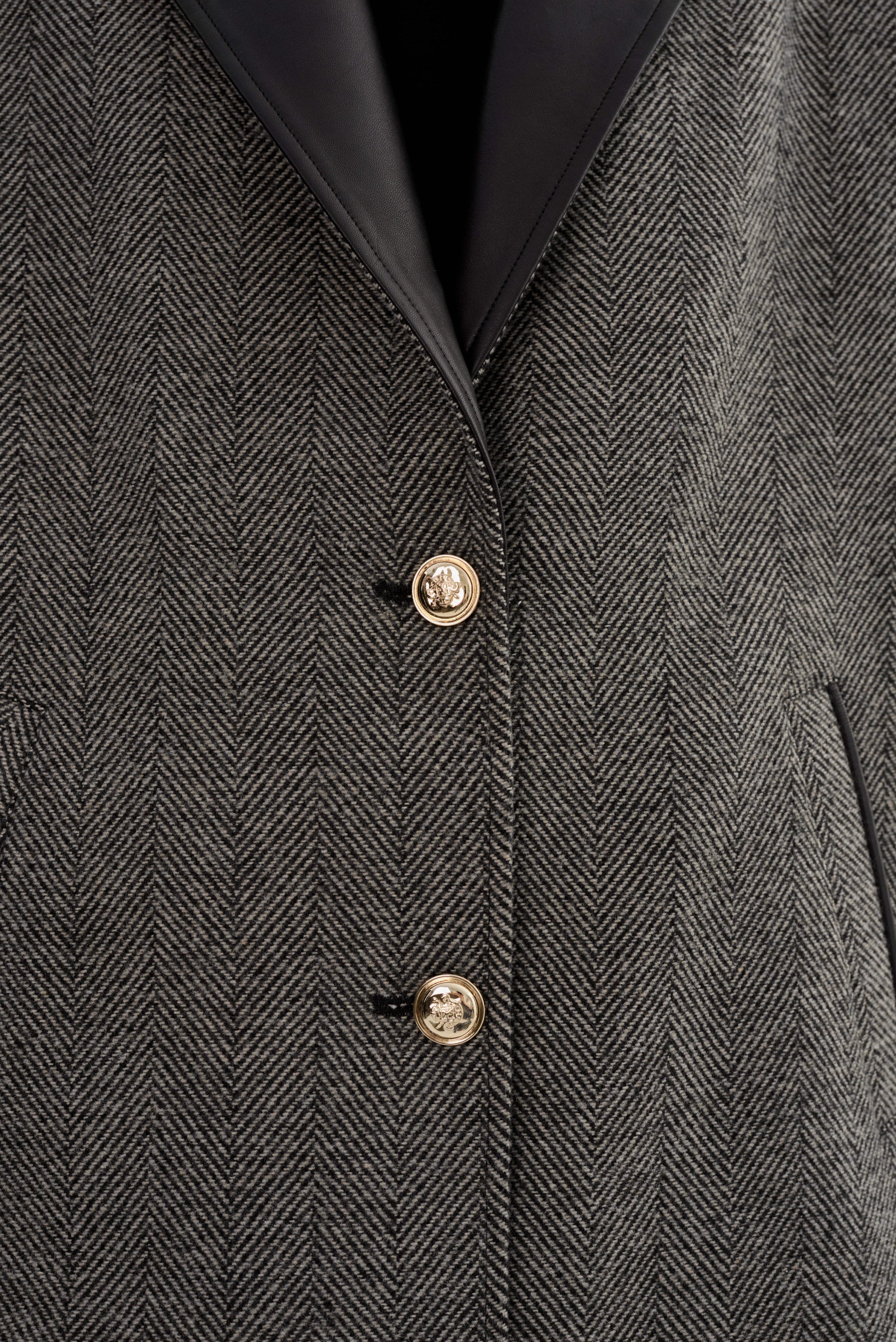 A modern update on classic tailoring. Crafted in twill tweed fabric with leather accents at the collar and cuffs, the EVIE blazer is cut in an oversized silhouette with sharp shoulders and polished gold-tone buttons. A standout layer that brings structure and edge to everyday looks.