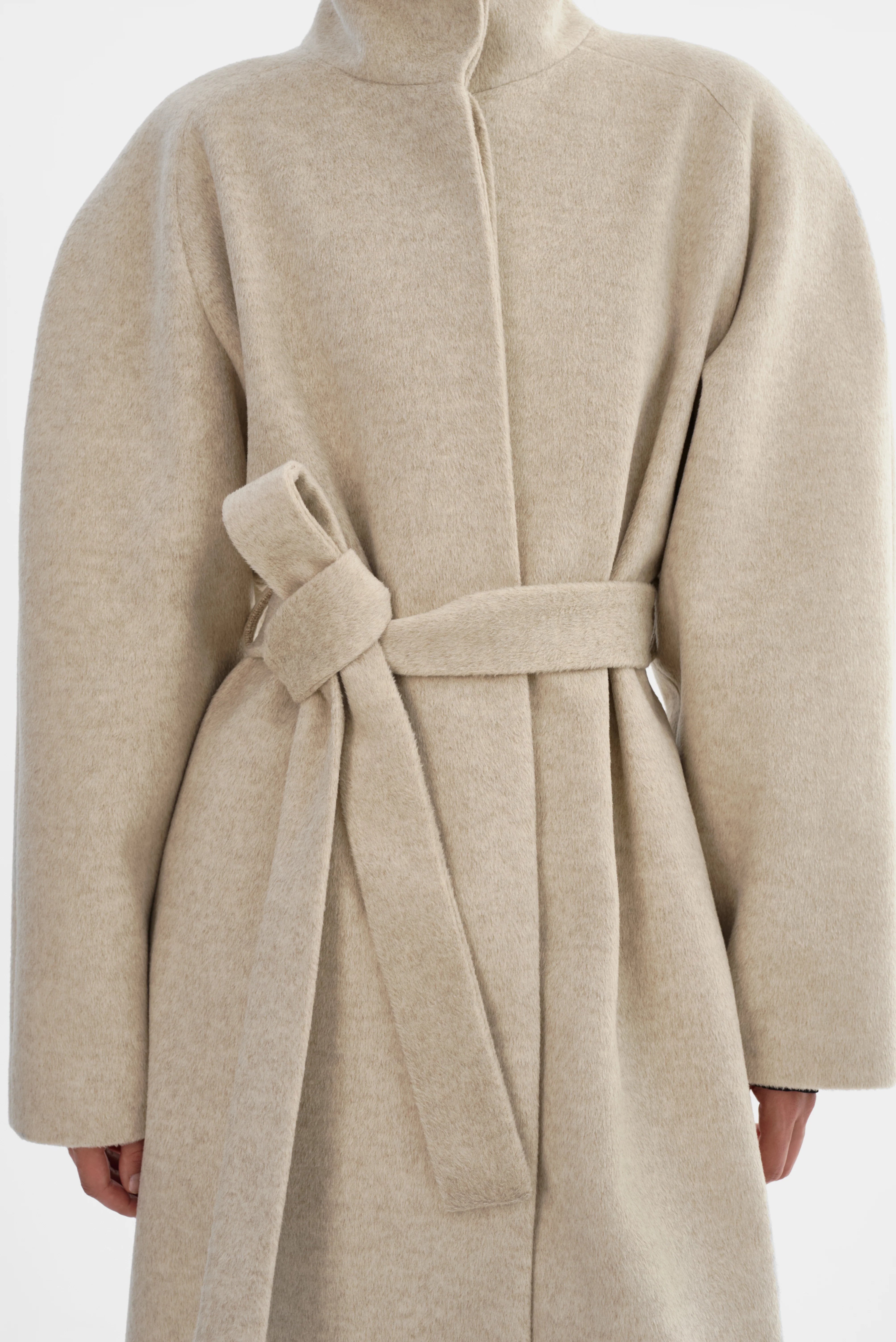 Refined and elevated, the SUNNIVA Long Wool Coat makes a statement in quiet sophistication. Designed with a structured funnel neckline and padded shoulders, it features a cinched waist with a self-tie belt. Crafted from a brushed double knit wool blend, this longline silhouette exudes modern minimalism.