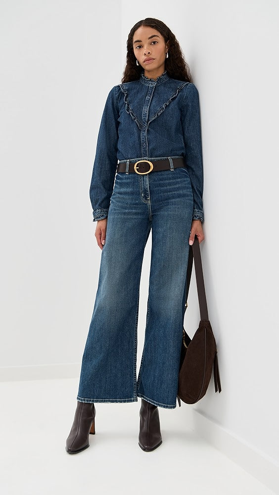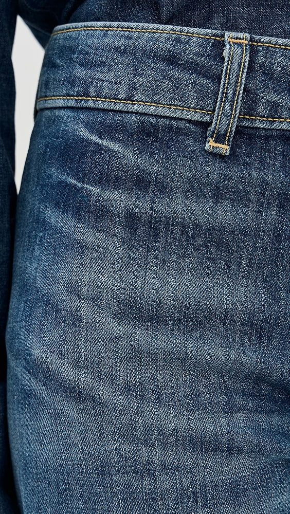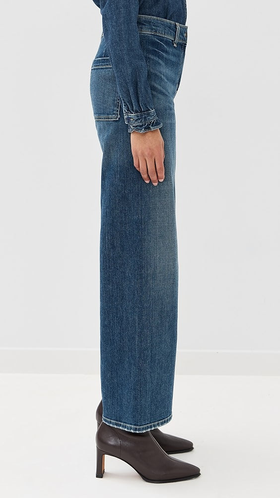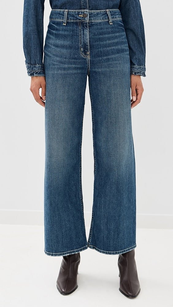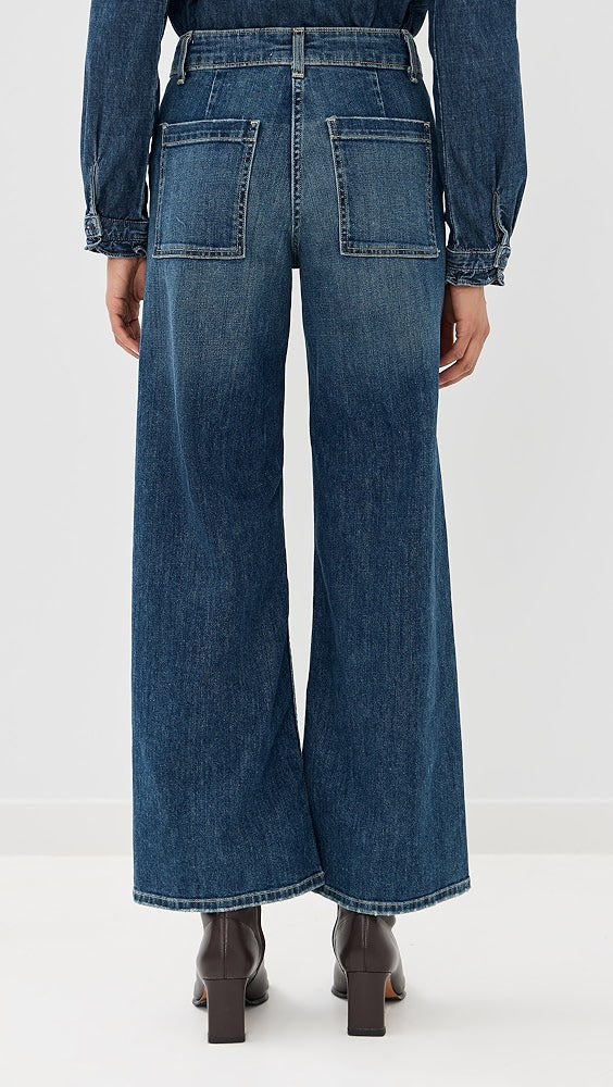 Mid-rise cropped wide leg jean in Japanese stretch denim. Fitted through waist and hips. Cropped ankle length. Opens to a relaxed leg. No front pockets. No outer side seam. Back patch pockets. Back darts. Zip fly. Shank closure. Belt loops.