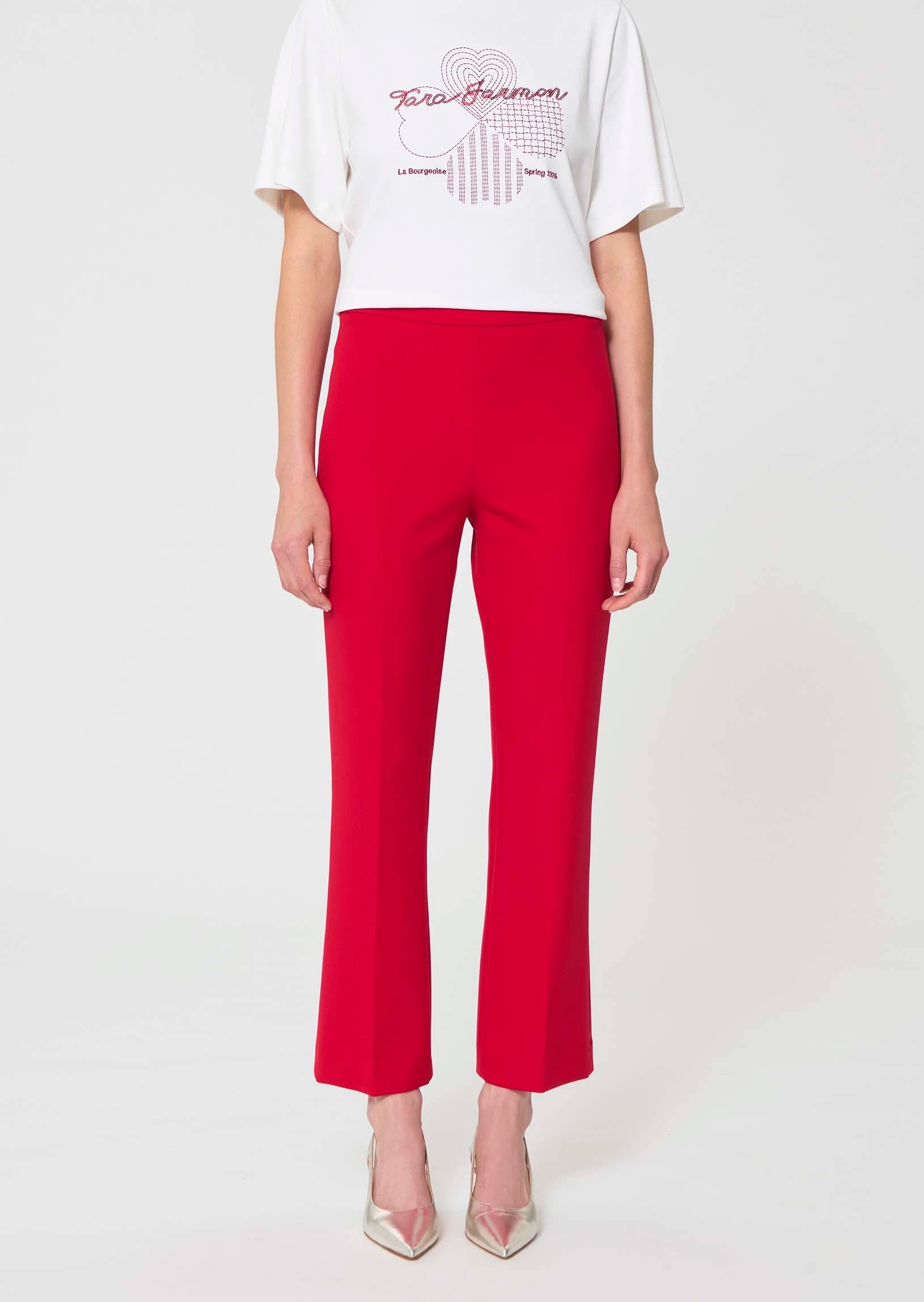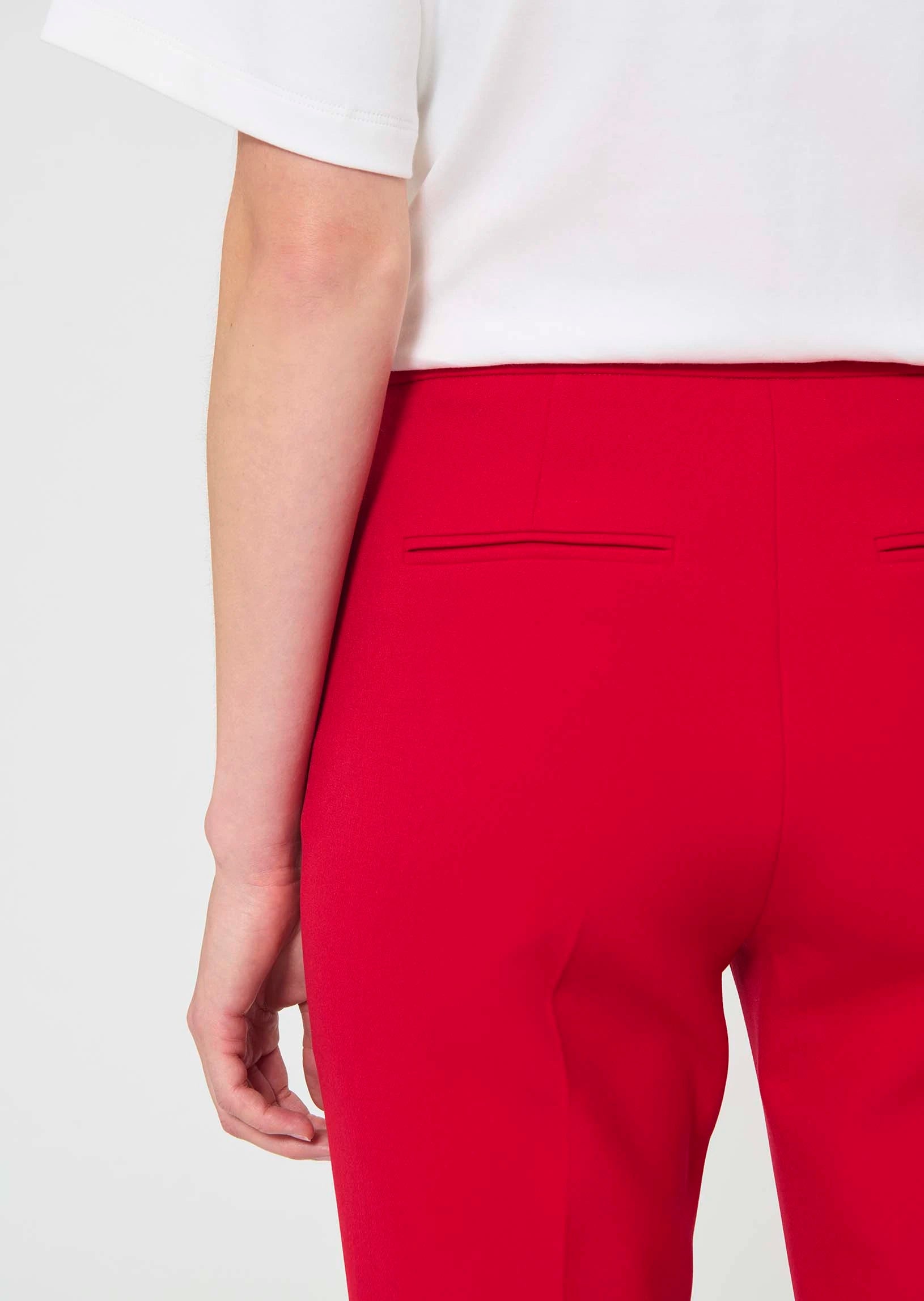 These cherry-red trousers in double-layered canvas have a cropped flared leg, a mid-rise waist, and welt pockets at the back. They fasten at the side with an invisible zip.