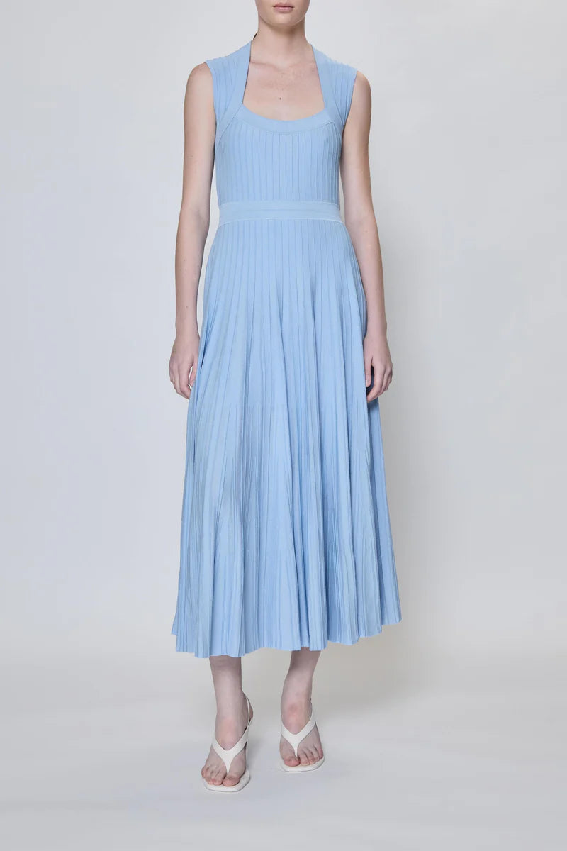 SIMKHAI Ashland Knit Midi Dress features a sleek midi silhouette defined by a refined, body-skimming fit. Designed with a modern knit construction and finished with a streamlined shape, it offers effortless elegance and sophisticated drape. A versatile piece that works seamlessly on its own or layered for an elevated look.