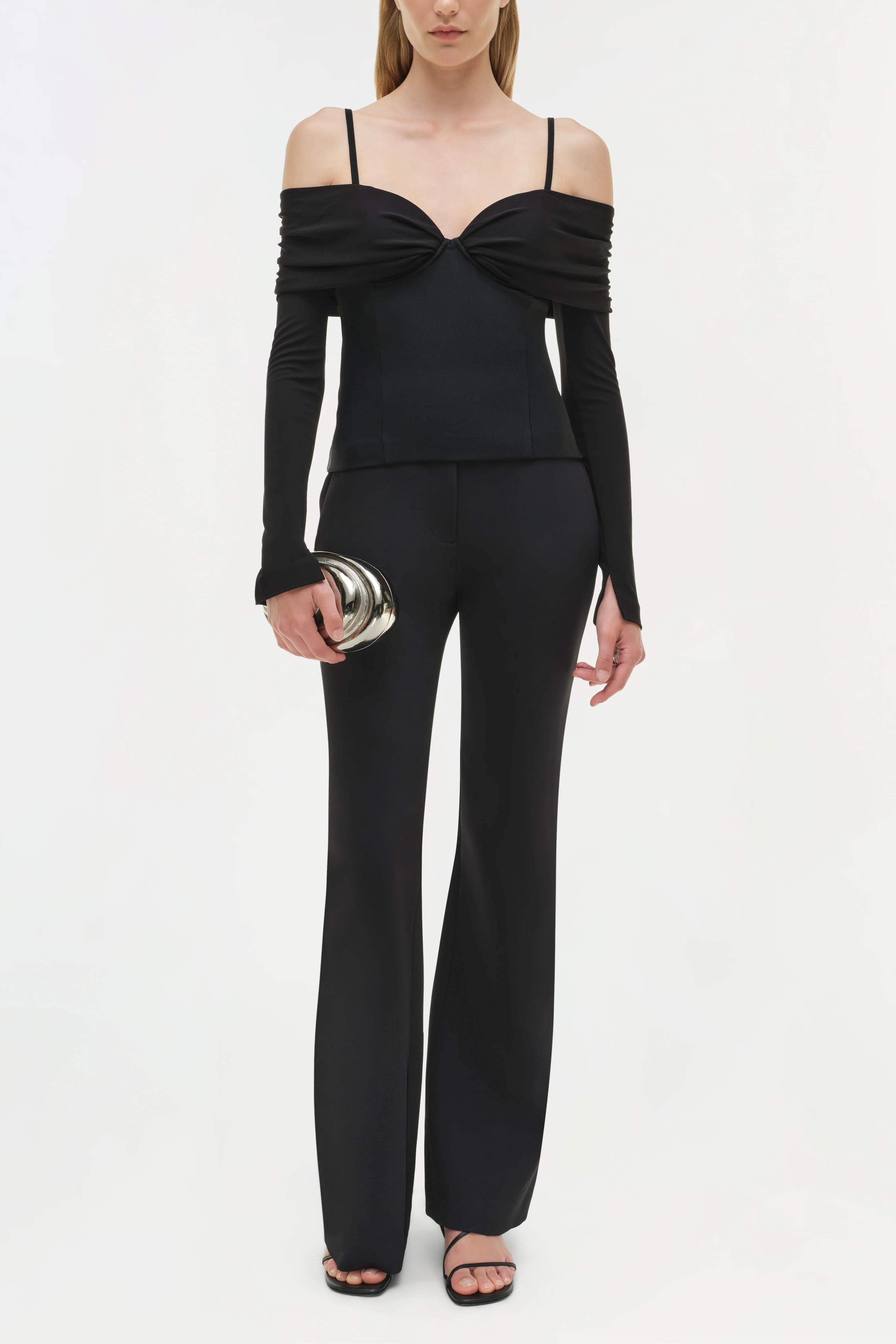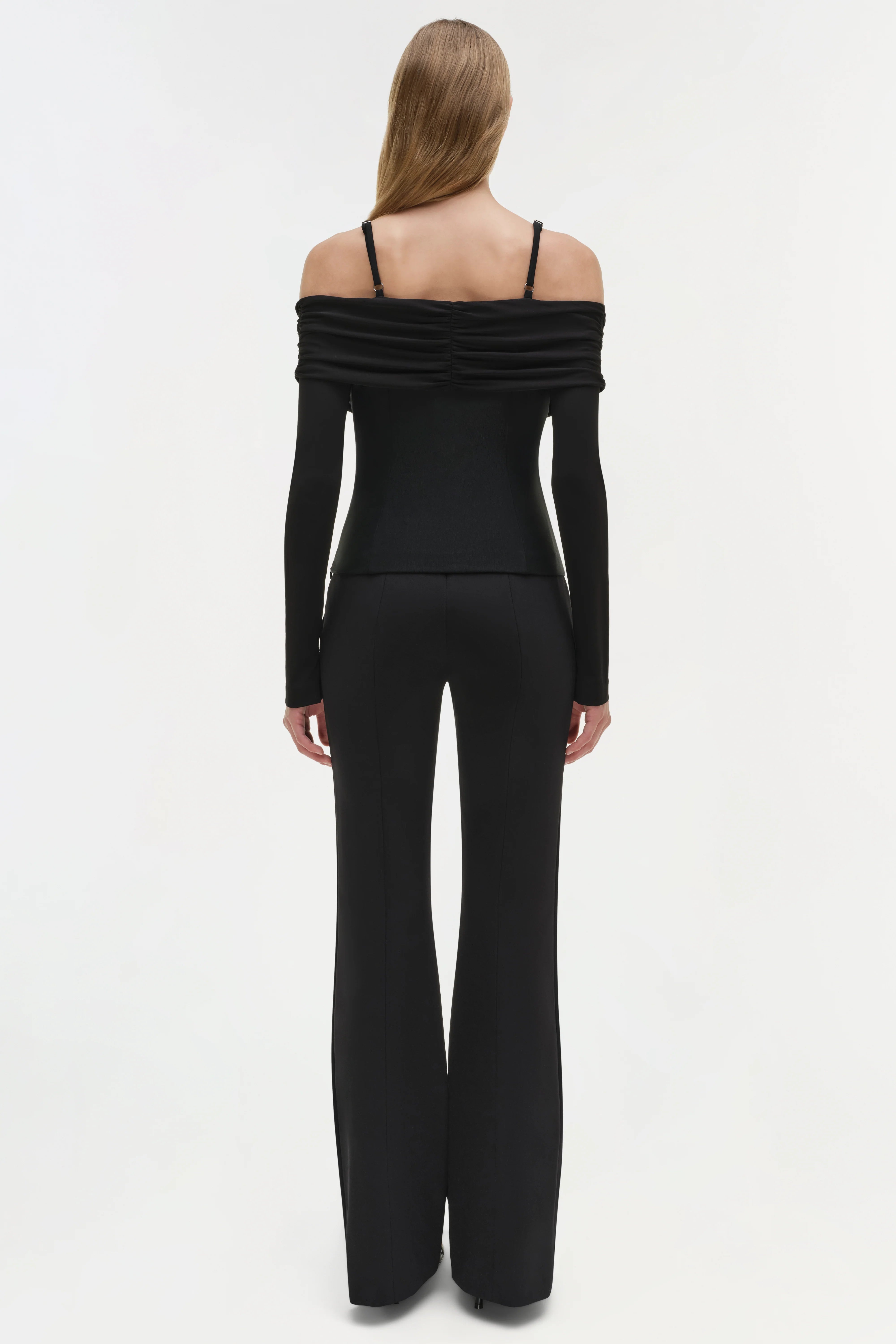 A long sleeve top with an underwire design and gathered off-the-shoulder design in sumptuously draped jersey