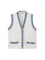 Phaedra is a textured cotton-knit vest accented with edgy torn denim trim and feminine gold buttons. The contrast of rugged and refined details creates a bold, modern piece that elevates simple styling with unexpected character.