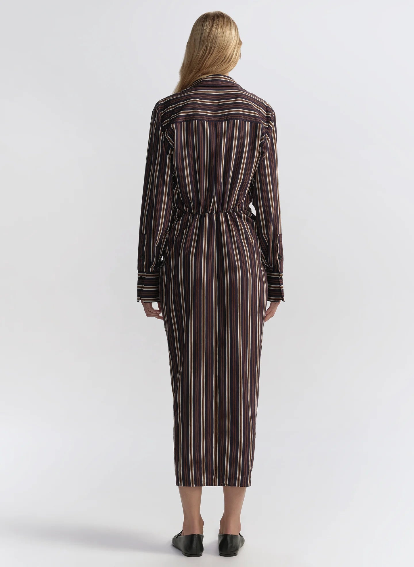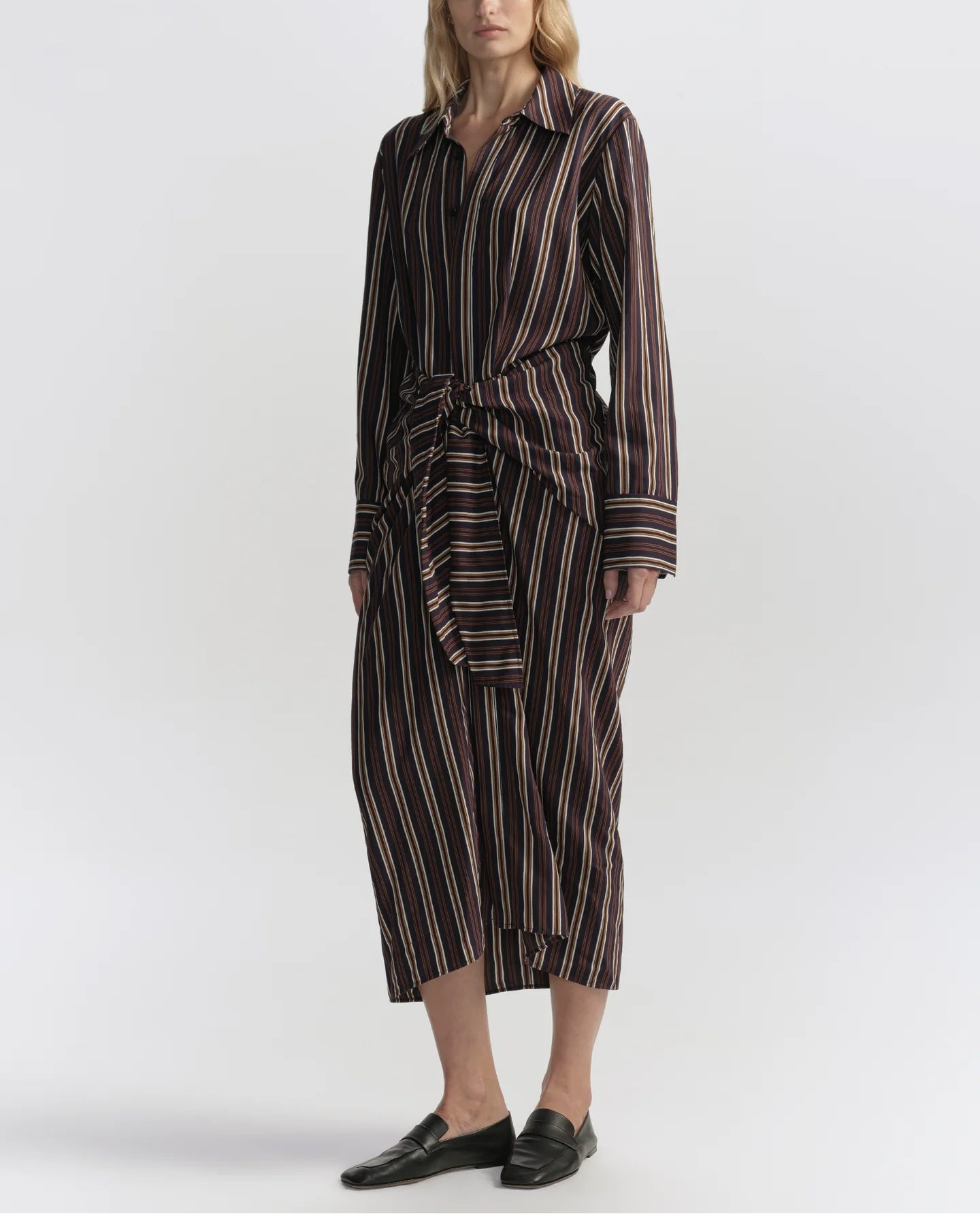 The Mila Dress is crafted from a soft, drapey viscose fabric in a vertical shirting stripe. This long-sleeve midi silhouette features wrap-tie detailing at the waist and elongated sleeves.