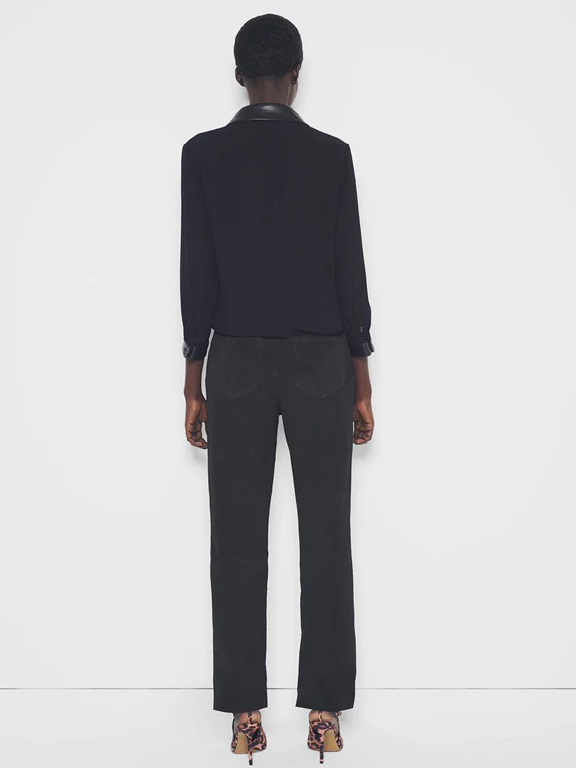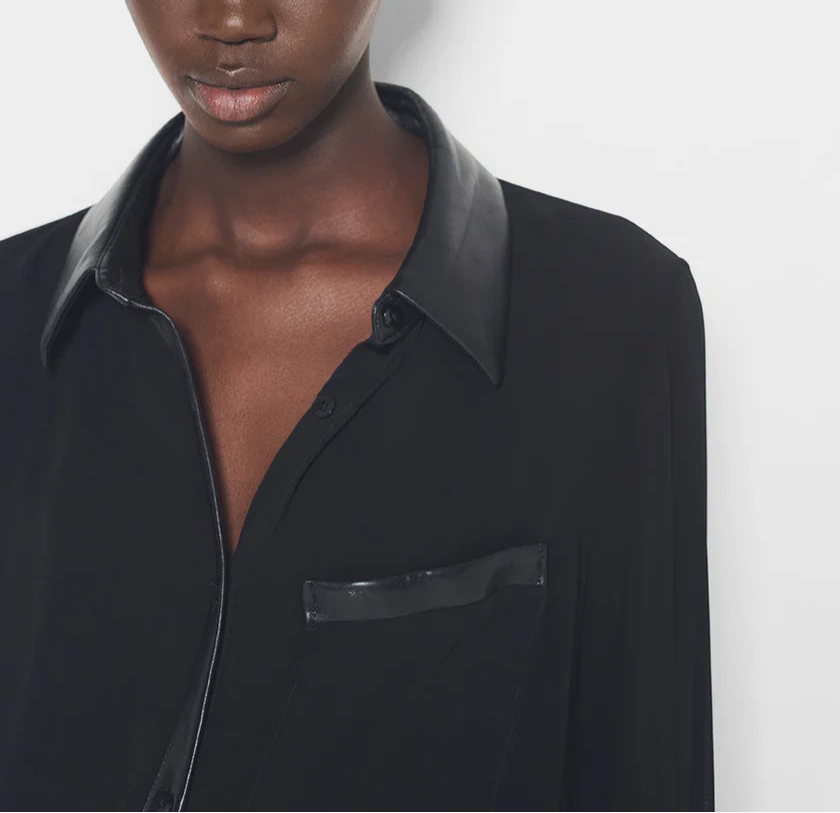 The Faith Blouse is a fall essential - This beauty features a contrasting recycled leather collar, recycled leather contrast button front placket, contrast long button-cuff sleeves and exquisite shell buttons. Style this with any leather pants and heels for a total took.