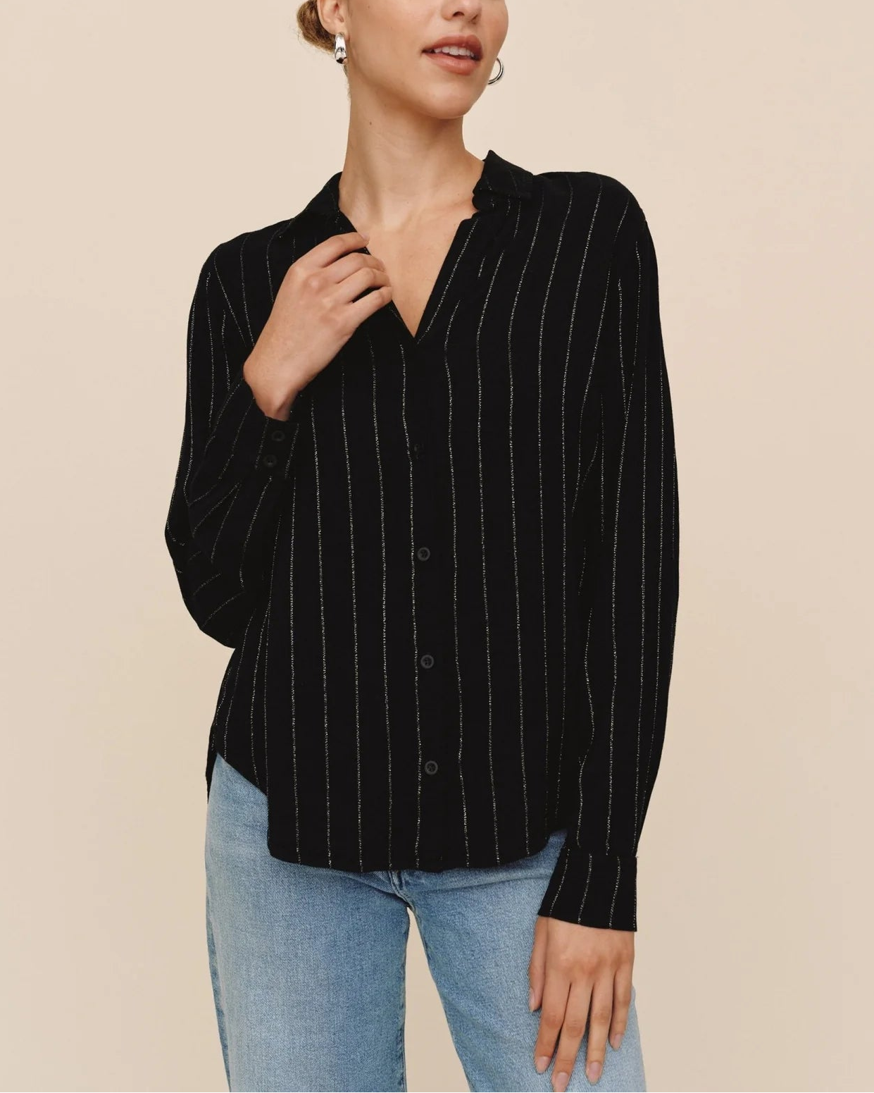 The Lurex Stripe Clean Shirt is a modern take on the classic button-down designed for polished day-to-night dressing.