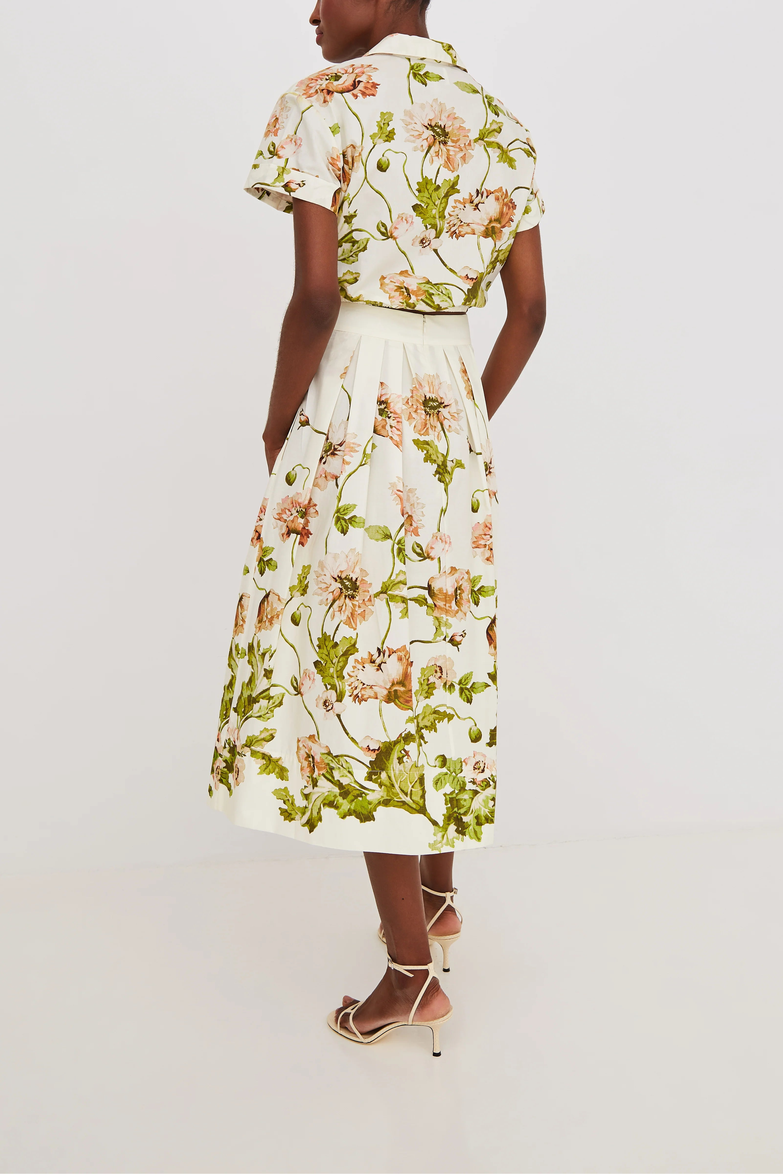 The beauty of the Marge Skirt is in its timeless simplicity. An effortless midi-silhouette cut in crisp cotton poplin, the functioning handmade novelty buttons add gorgeous texture against the vintage inspired floral print. Inspired by Cara Cara's favorite heroine, Marge Sherwood from The Talented Mr. Ripley, this piece feels like a sun-kissed holiday. Pair with a knotted white top or matching Asbury Top.