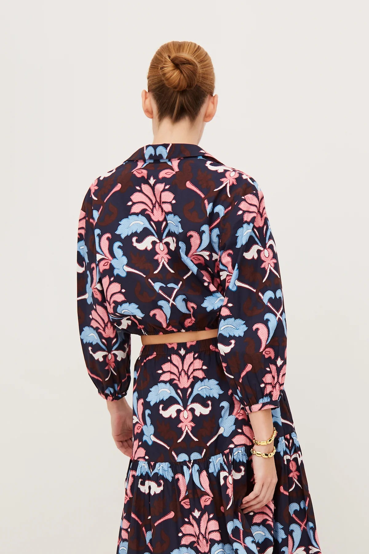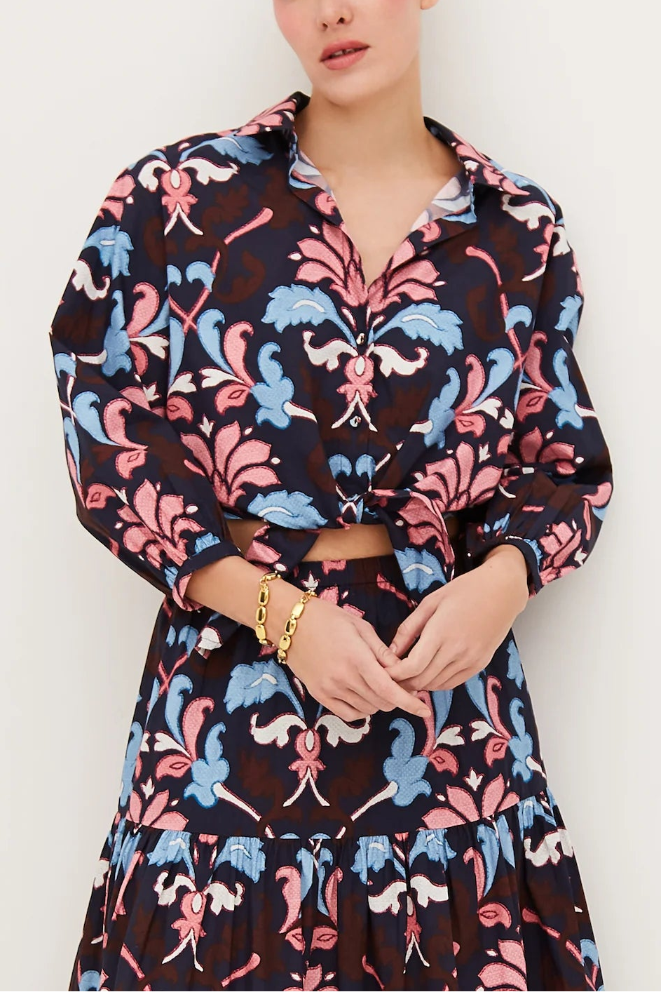 • Long sleeve easy button down collared shirt with self ties at front hem • Elastic at sleeve cuffs and back hem • Signature self-covered buttons with gold eyelets • Drop shoulder • Slight ruching above cuff • Allover placed print • Unlined