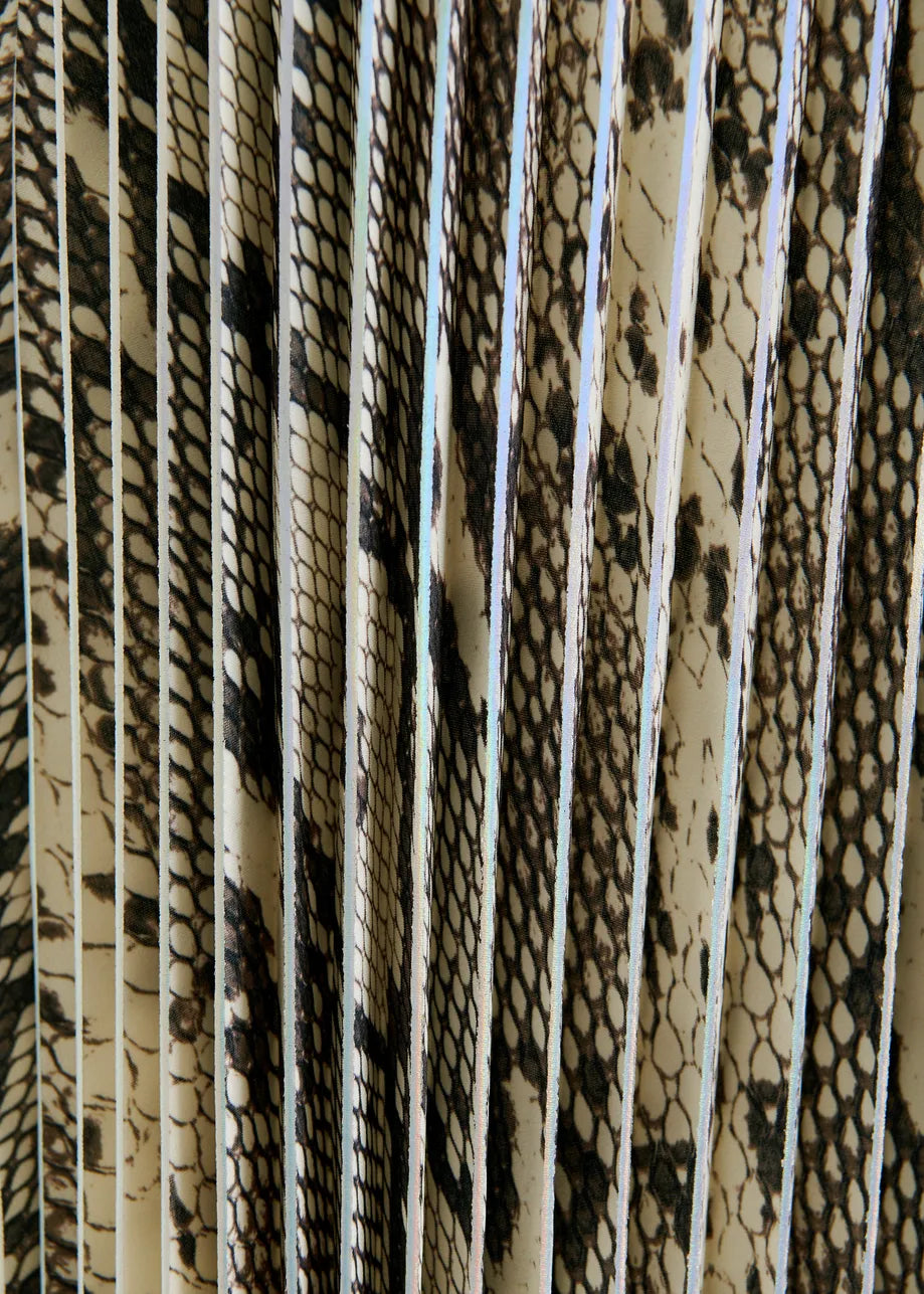 Pressed with sharp accordion pleats for movement and texture, this midi-length skirt is adorned with a snake print. It features a fitted high-rise, elasticated waistband and is finished with raw hemline edges