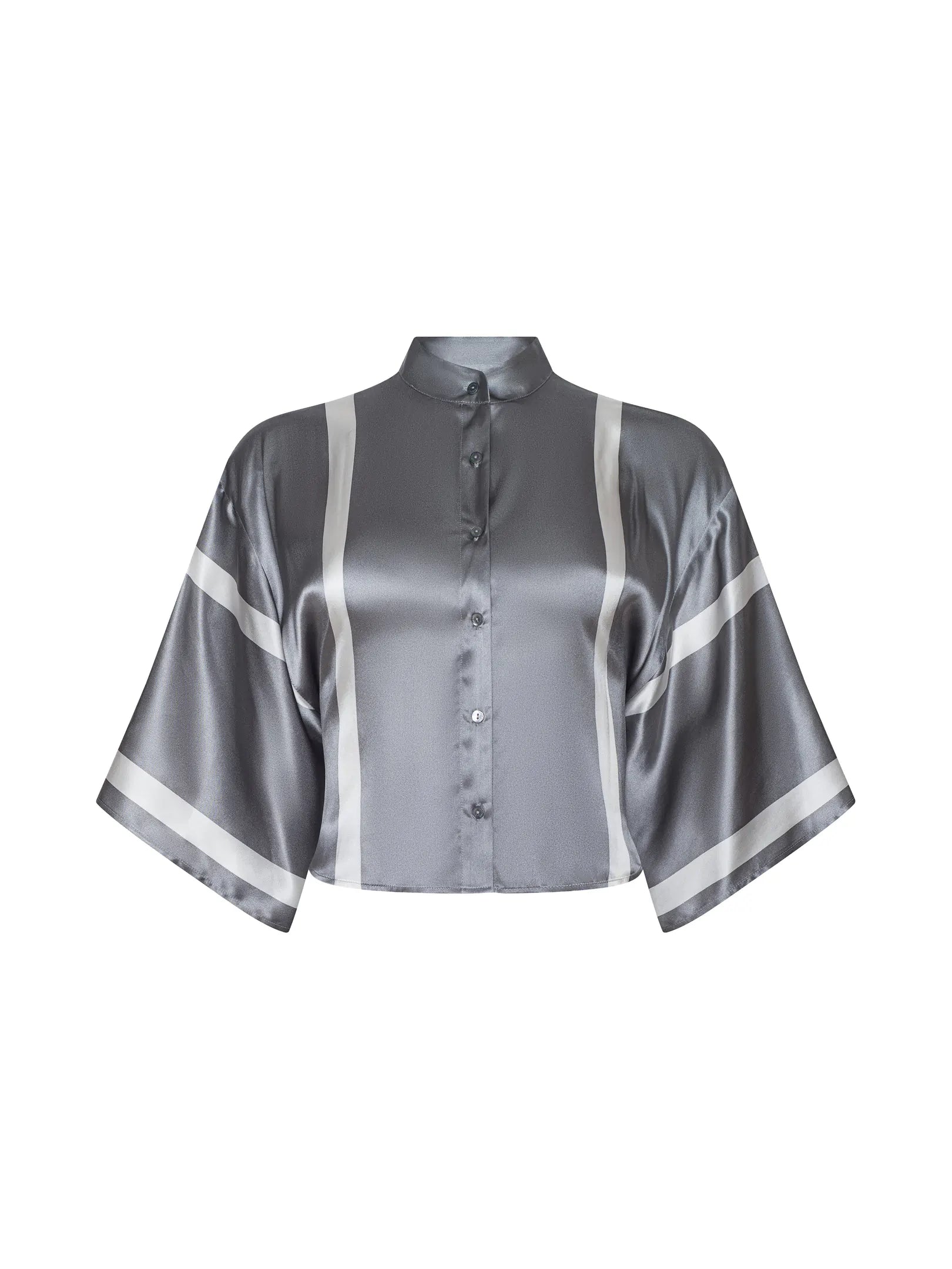 The Dru silk blouse blends dramatic ease and polished minimalism. Crafted from fluid silk, it features wide, kimono-inspired sleeves that create an artful sense of movement, accentuated by bold, graphic stripes. The cropped, button-front silhouette feels modern and refined—perfect with high-rise denim, tailored trousers, and more.