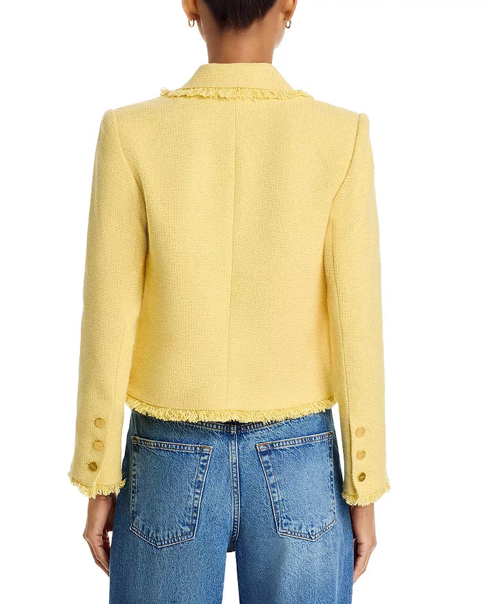 A luxe fabrication meets a classic cut in the collared Sylvia jacket. Fringed trims and embossed gold buttons complete its look. Now back in bright yellow.