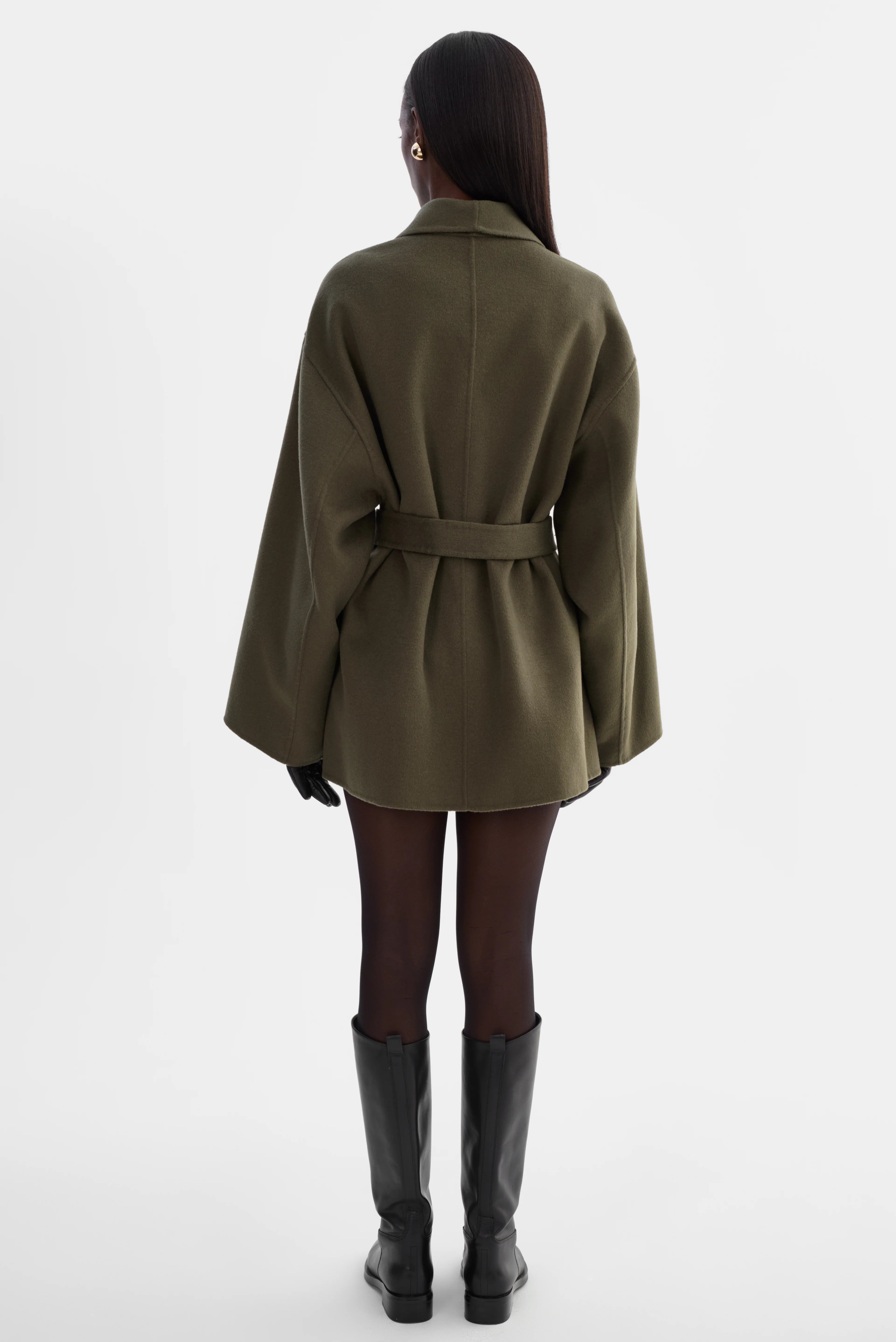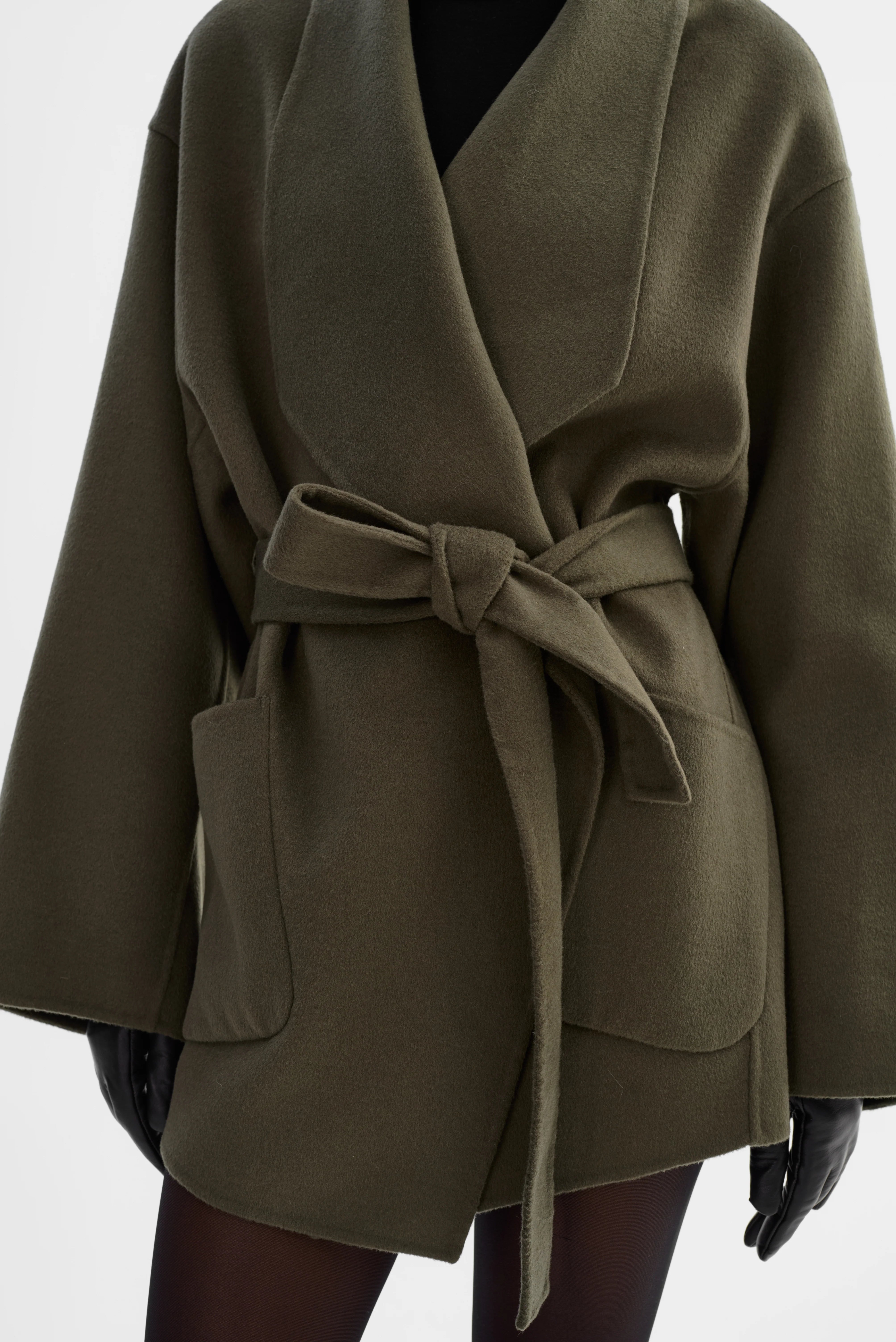 The MEKIA Double-Face Wool Coat effortlessly combines elegance and contemporary style. Crafted from luxurious double-face wool, it features a cascade drape collar and diagonal front patch pockets, adding both sophistication and functionality. The self-tie waist belt allows for a customized fit, while the unlined design ensures a lightweight feel. Perfect for transitional weather, this coat is ideal for layering, adding a polished touch to any outfit.