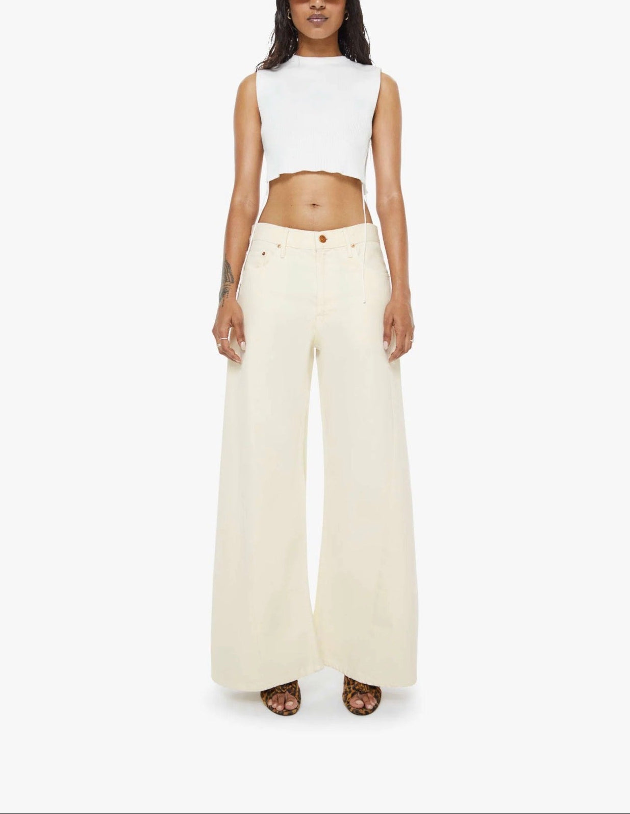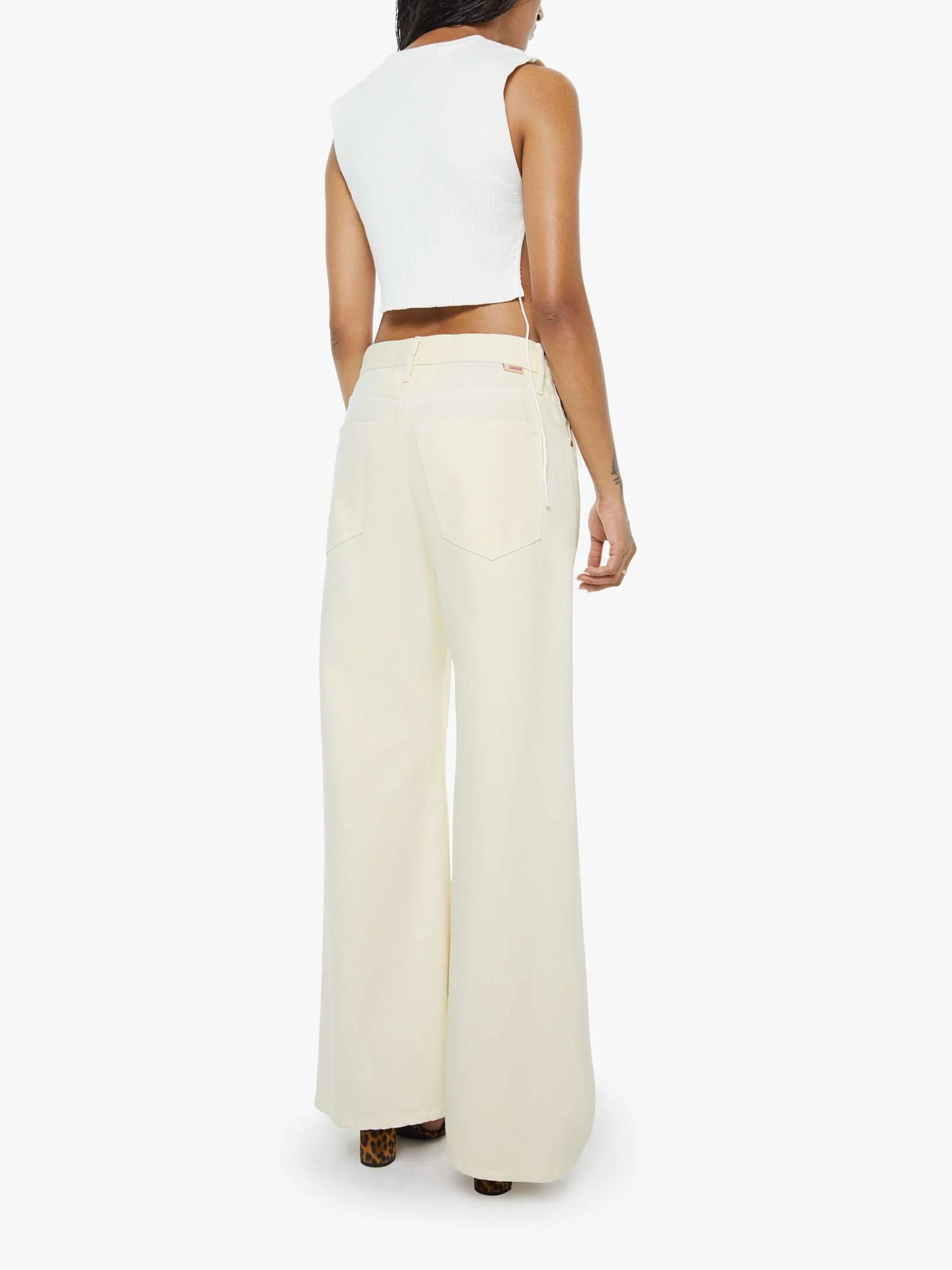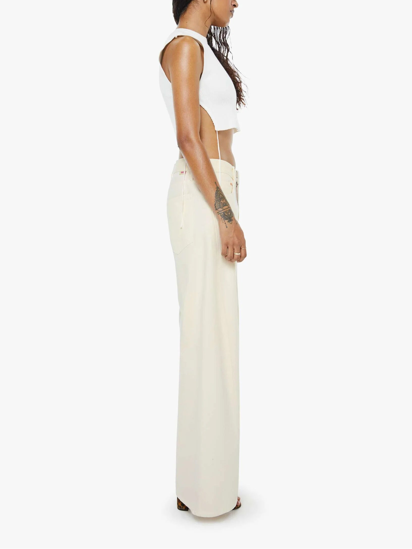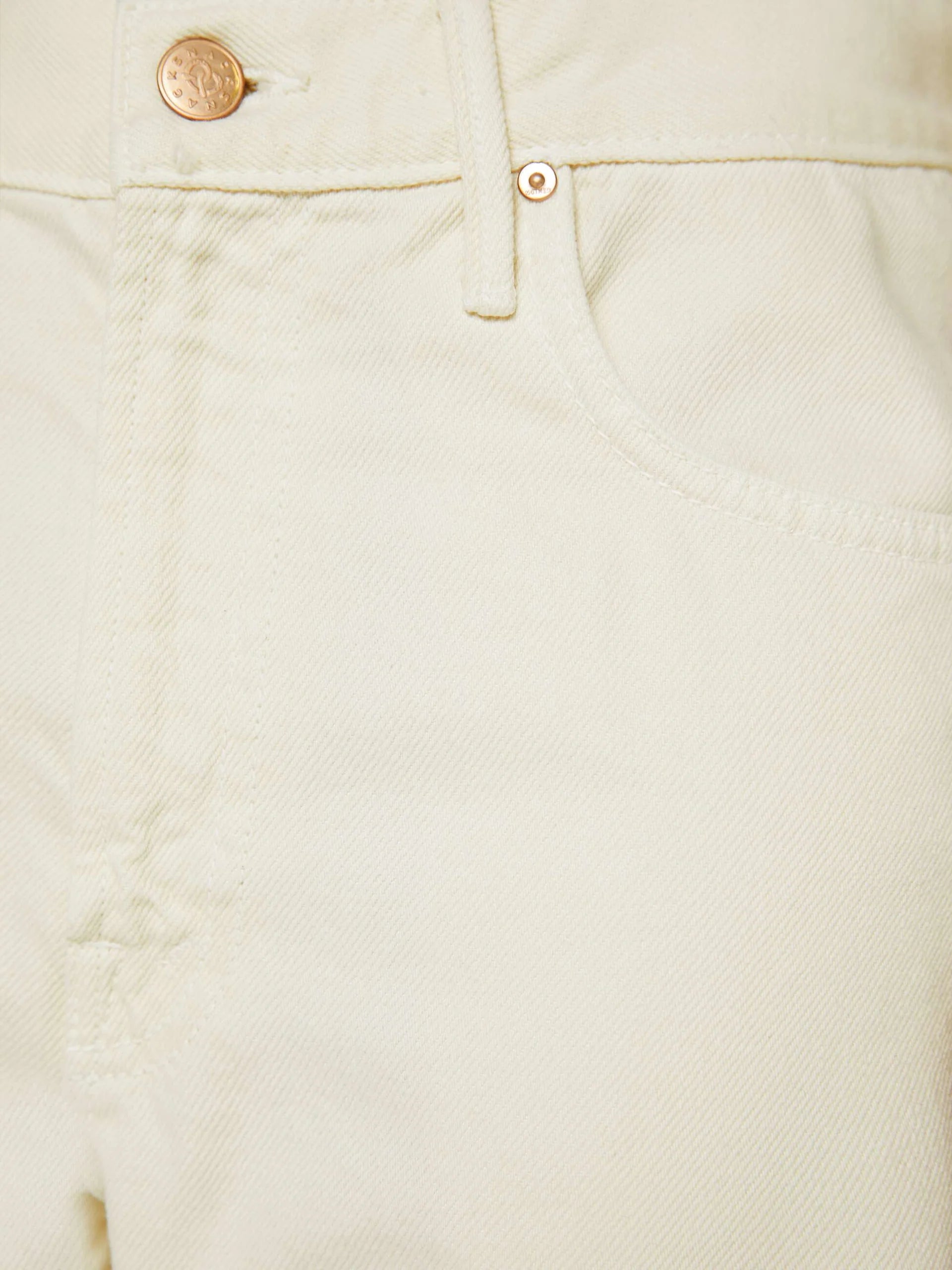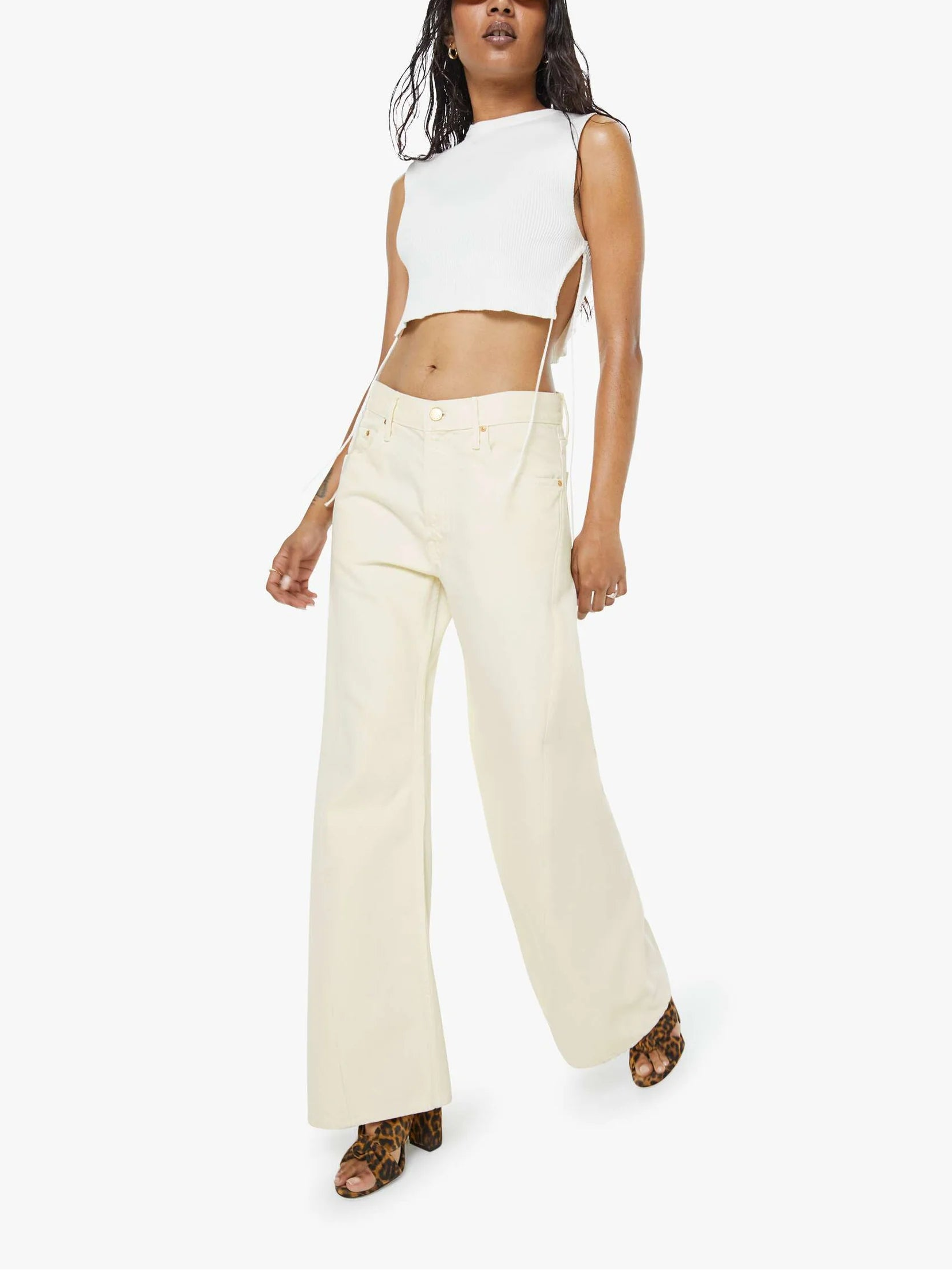Wide leg jeans from SNACKS!, a collection of unconstrained silhouettes leaning into exaggerated shapes and extreme proportions. Experimental and non-era specific. For everyone, or not. Designed to sit on the hips with a slouchy fit, these super high-rise jeans have a zip fly, loose wide leg with a curved outer seam and a long 29-inch inseam with a clean hem. Made from a rigid recycled cotton blend, Natural is a creamy off-white with a pretzel-detailed button and candy-inspired interior rivets. Would you like a treat?