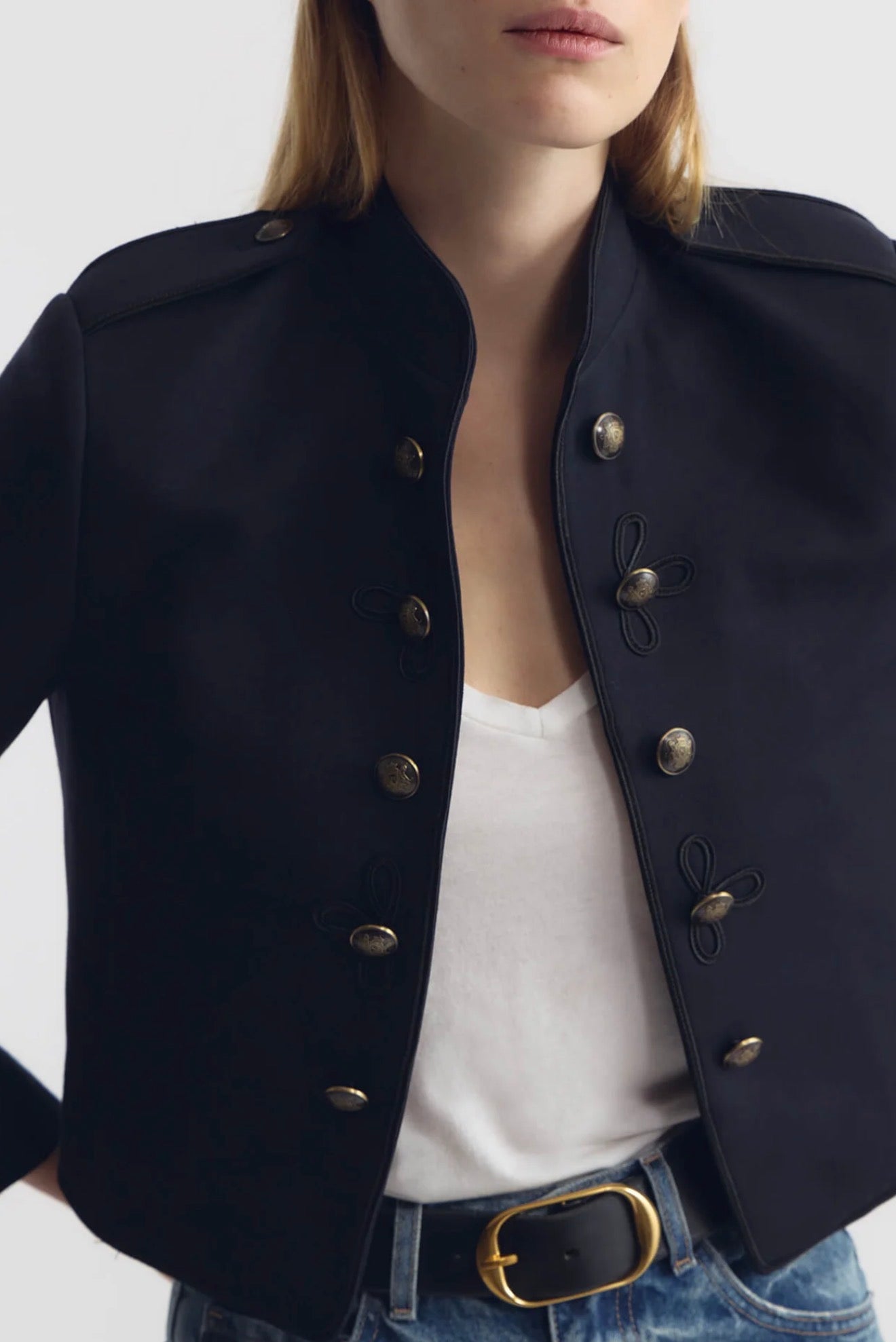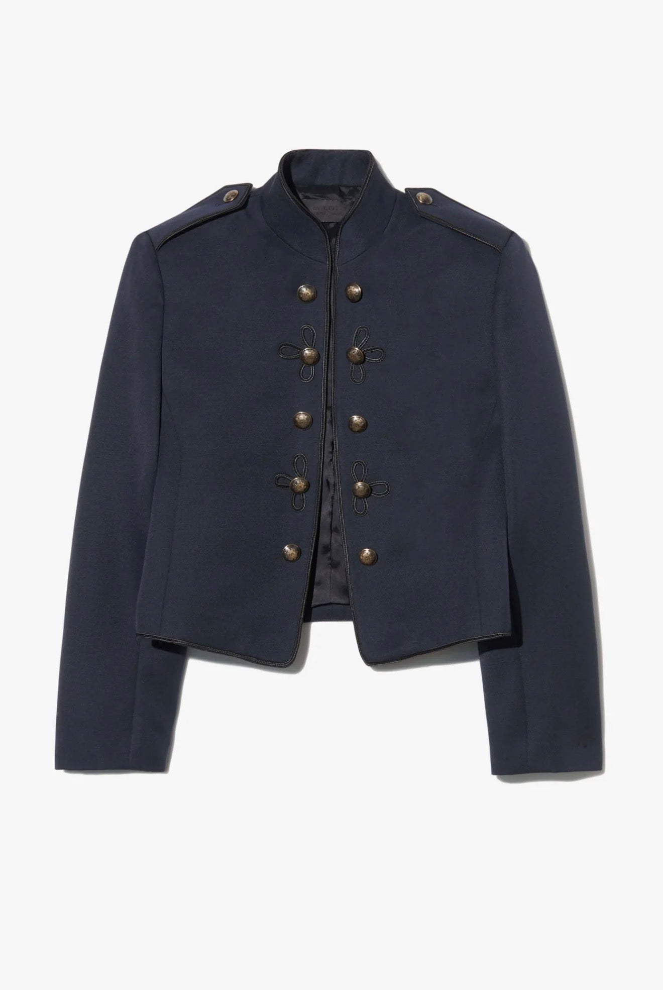 Short band jacket with soft shoulder pads and epaulettes. Features back seams, functioning sleeve placket, cording detail, and a collar stand.