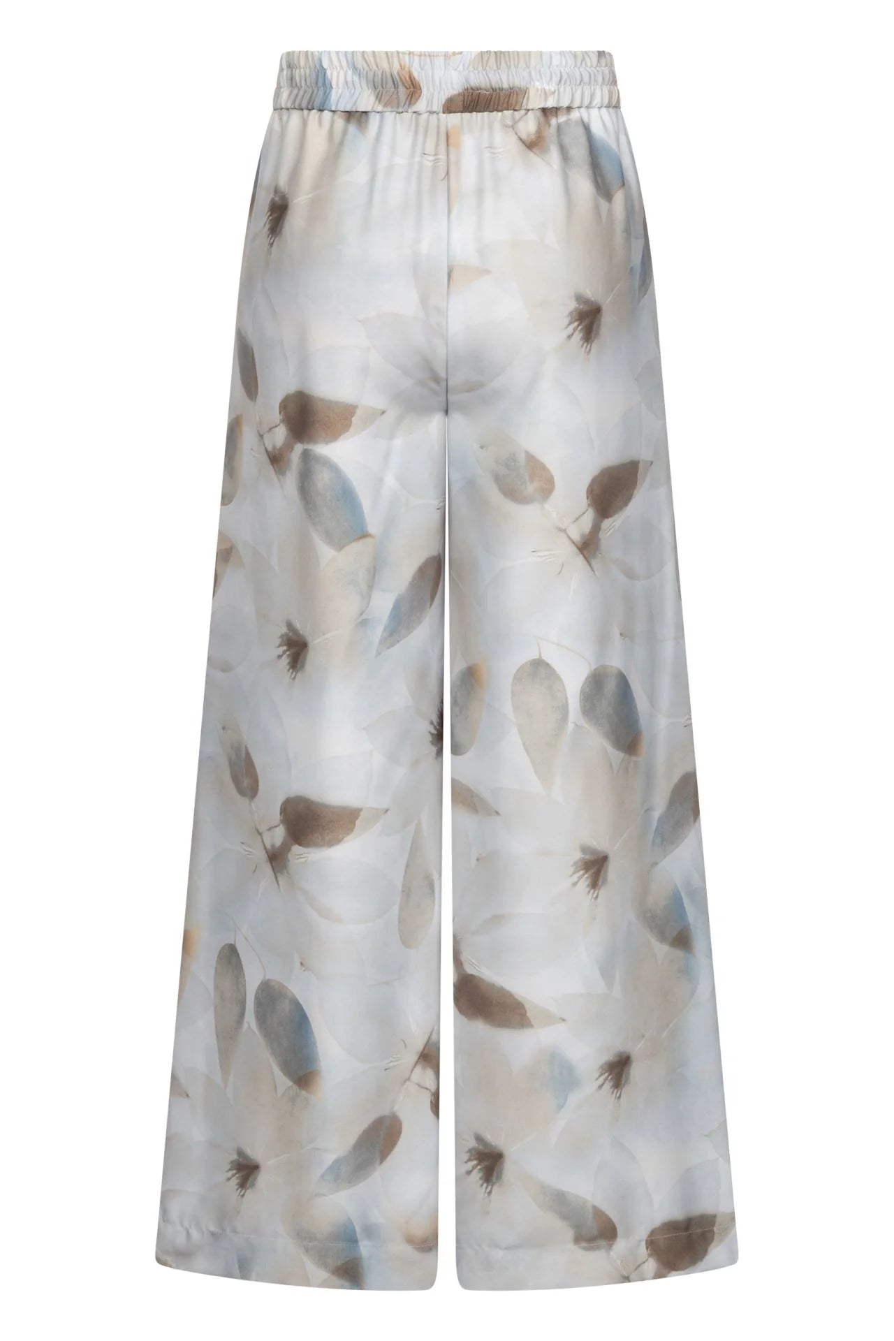 Raffaello Rossi Helena pant crafted in fluid, lightweight fabric with a soft grey botanical print. Features an elasticated waistband with outer band detail for a clean finish. Designed with a wide-leg silhouette and seamless side construction, offering effortless drape and elevated comfort for refined everyday wear.