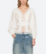 The Sofia embroidered blouse features a v-neckline, voluminous puff sleeves, and delicate pin-tuck detailing. Cut-out lace throughout adds a subtle sheer element, creating a romantic, airy silhouette.
