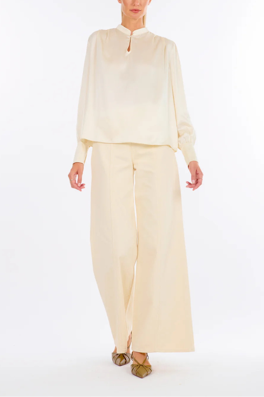 Secret Mission’s Arden Blouse is crafted from 100% sand-washed silk, offering a smooth and fluid drape. Designed with a soft cowl neckline, long cuffed sleeves, and a relaxed silhouette for understated elegance. Styled with our Nikita Pant, this piece embodies quiet luxury and timeless sophistication.