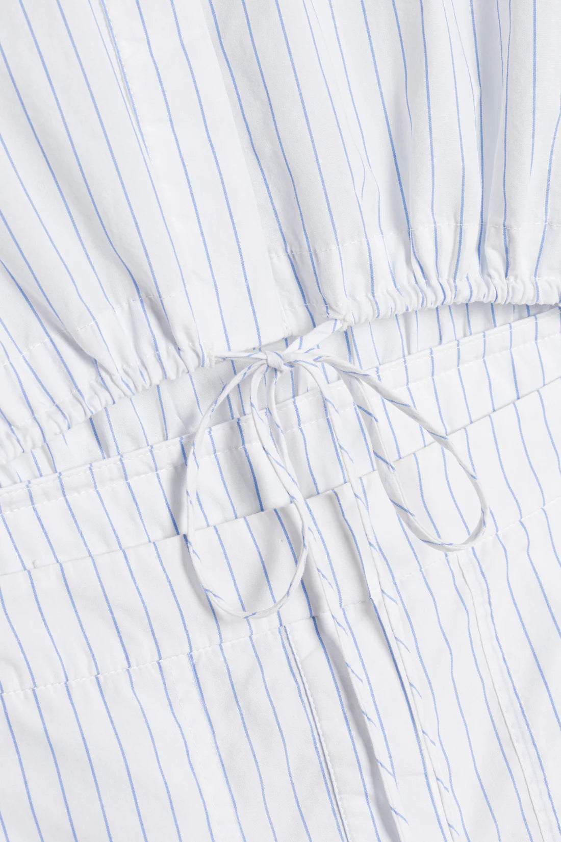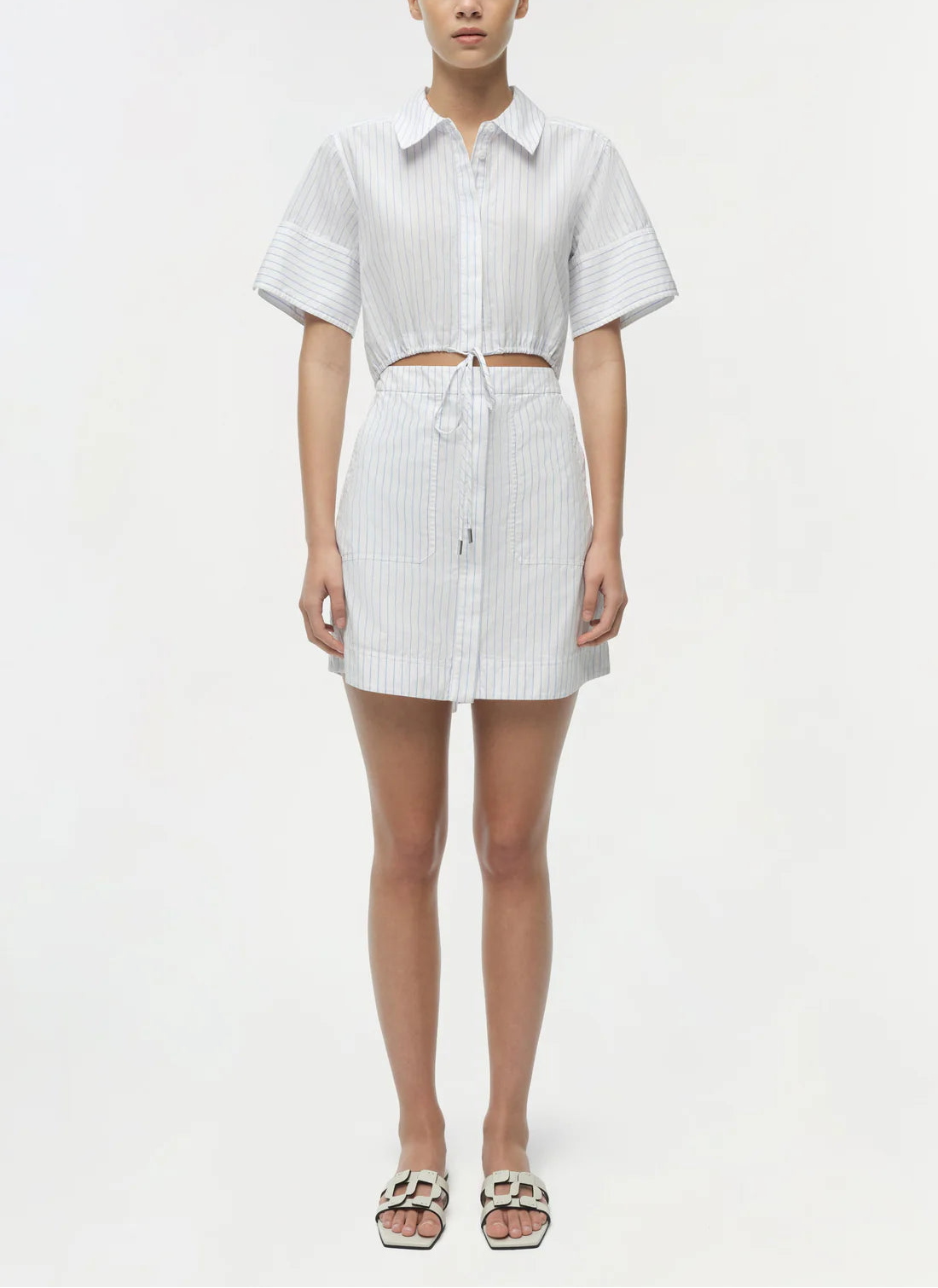 The Marcy Cotton Mini Shirt Dress in White Stripe.Crafted in a button-up style, this cotton mini dress combines polished shirting details with exaggerated sleeves, creating a balanced, contemporary look.