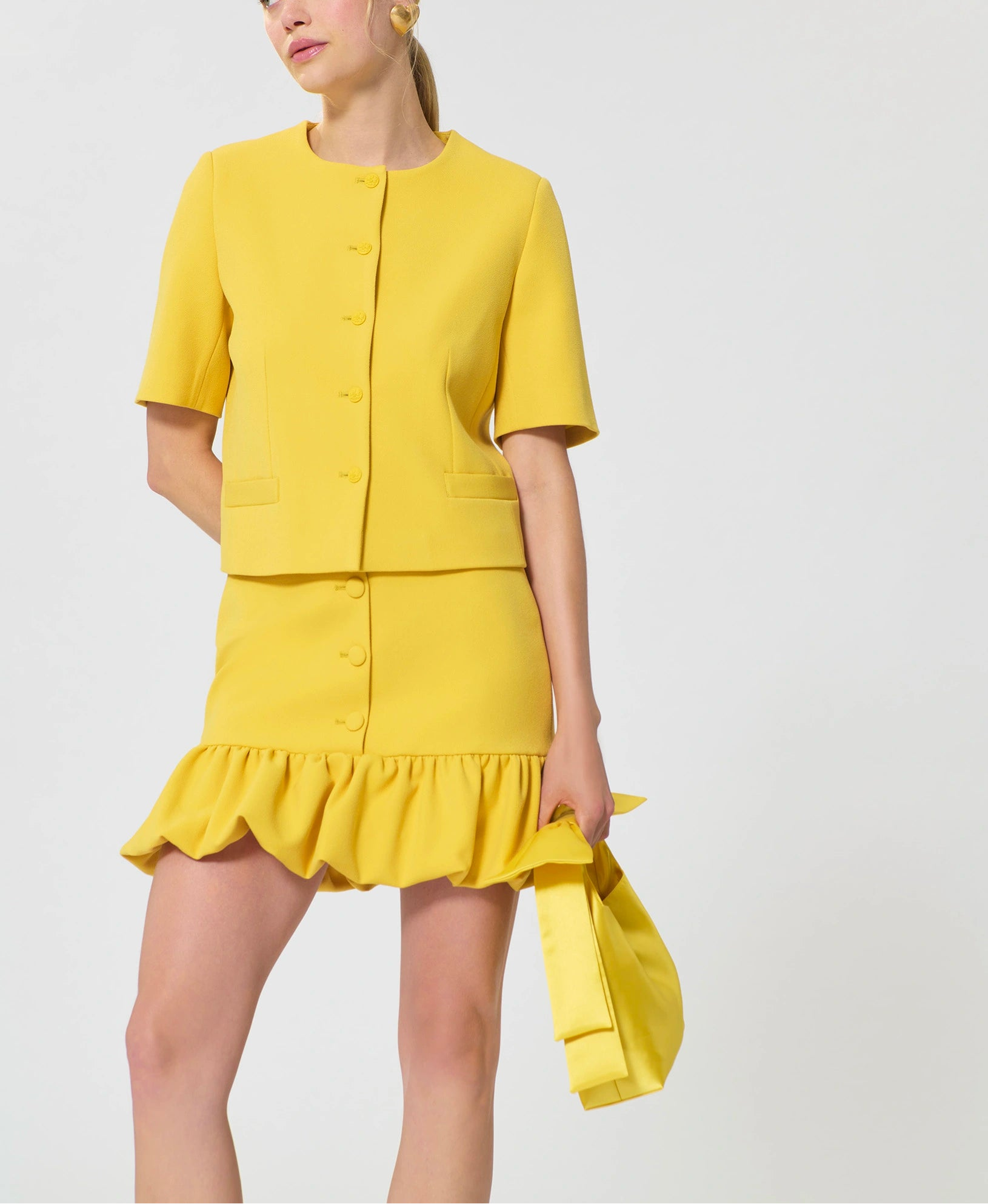This short, mimosa-yellow jacket in soft crepe features a round neck, short sleeves with shoulder pads, and small welt pockets at the sides. It's fitted at the waist and fastens at the front with matte, tone-on-tone buttons. For a complete preppy look, wear it with the matching Josef skirt.