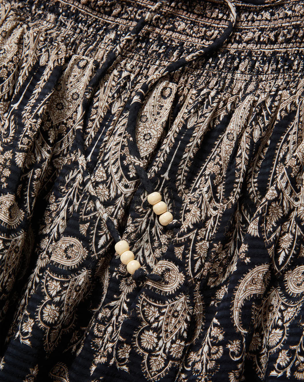 Bohemian romance with throw-on-and-go ease. Crafted from a lightweight, breathable cotton blend, the Ayanna maxi dress features an all-over paisley print in black and beige. A smocked, ruffle-trimmed bodice with bead-and-tassel halter straps define shape, while a full A-line skirt adds breezy movement. Finished with slanted side pockets, it’s a versatile, packable piece for your next trip—dress it up with strappy heels, or down with flat sandals.